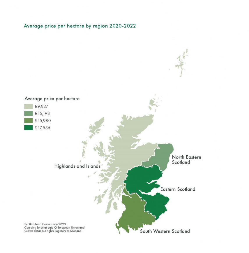 Map 3 shows the average price per hectare for all land sales, highest in Eastern Scotland and the Borders.