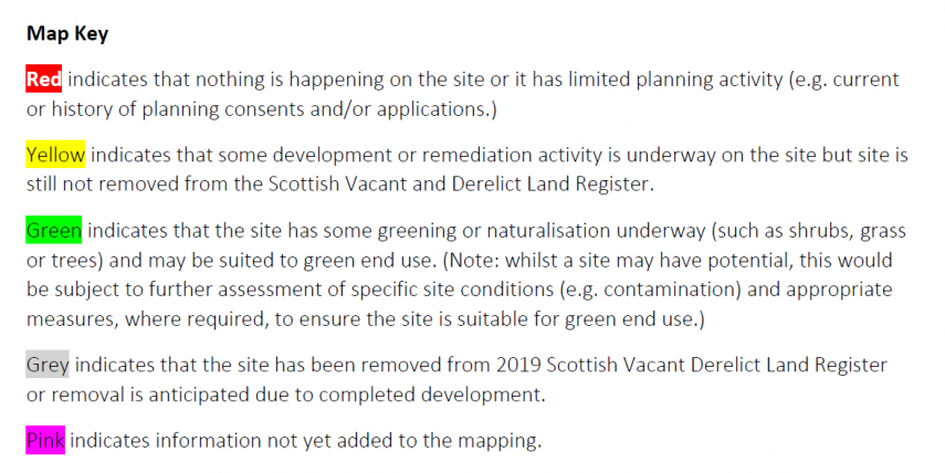 Please note that the data is taken from Scotland’s Vacant and Derelict Land Register which is collected by the Scottish Government on an annual basis through submissions made by local planning authorities. All efforts have been made to ensure accuracy of the data and this will be kept under review and updated. If you have any queries regarding the data on the map please contact info@landcommission.gov.scot. For information on specific sites, please contact the relevant local planning authority.